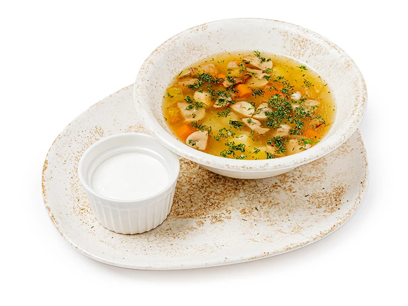 Шампиньоны, картофель, перловая крупа, лук, морковь, сметана, зелень