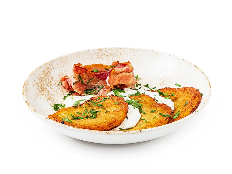 Грудинка, картофельные оладьи, творожно-сметанный соус, зелень